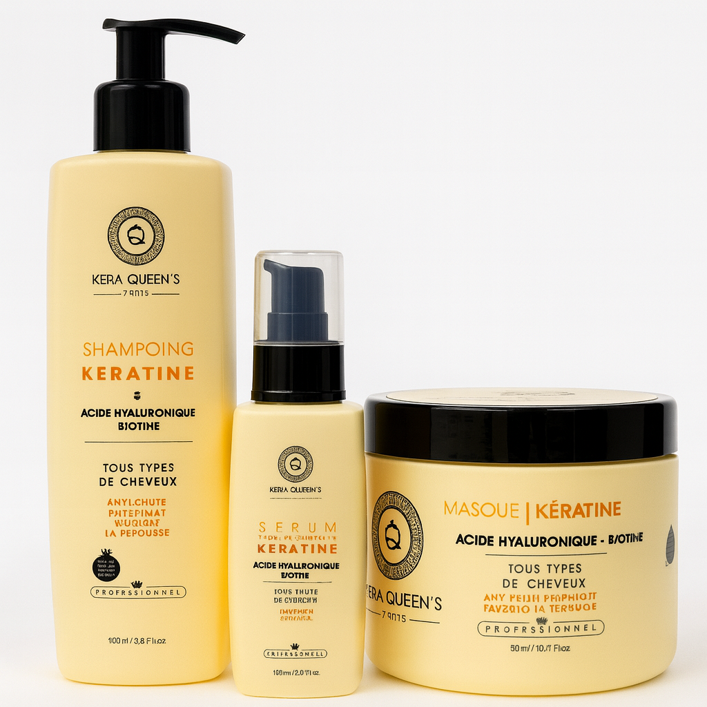 Kit Kera Queen’s Kératine, Acide Hyaluronique & Biotine – Shampooing, Masque & Sérum – Tous Types de Cheveux